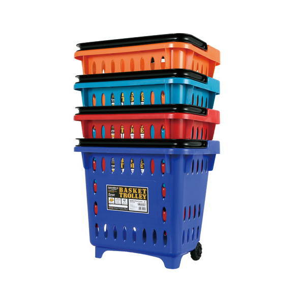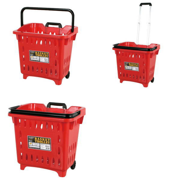 丈夫なプラスチック製のバスケットに伸縮可能なハンドルとキャスターが付いたトロリー。