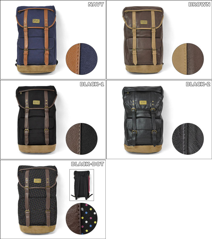 (かばん本体の素材/ベルトの素材/背面サイドのジップの色) NAVY・・・キャンバス/フェイクレザー/オレンジ BROWN・・・フェイクレザー/フェイクスウェード/ブラウン BLACK-1・・・キャンバス/フェイクレザー/ブラック BLACK-2・・・フェイクレザー/フェイクレザー/ブラック ※底部の素材は全色共通でフェイクスエード。